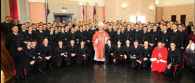 125 Allievi del 144° Corso “Lorenzo Gennari” della Scuola Allievi Carabinieri di Reggio Calabria hanno ricevuto ieri, nel corso di una suggestiva quanto partecipata funzione, il sacramento della Confermazione. A celebrare il rito è stato l’Ordinario Militare per l’Italia, S.E. Mons. Gian Franco Saba, che per la prima volta ha fatto visita all’Istituto reggino, dopo il suo insediamento a capo dell’Ordinariato Militare nell’aprile di quest’anno. Presenti nell’aula magna della Scuola, oltre ai cresimandi, i loro padrini e madrine, e i numerosi amici e familiari giunti per festeggiare con loro, oltre agli Ufficiali e Sottufficiali istruttori e al Cappellano Militare, Don Aldo Ripepi.