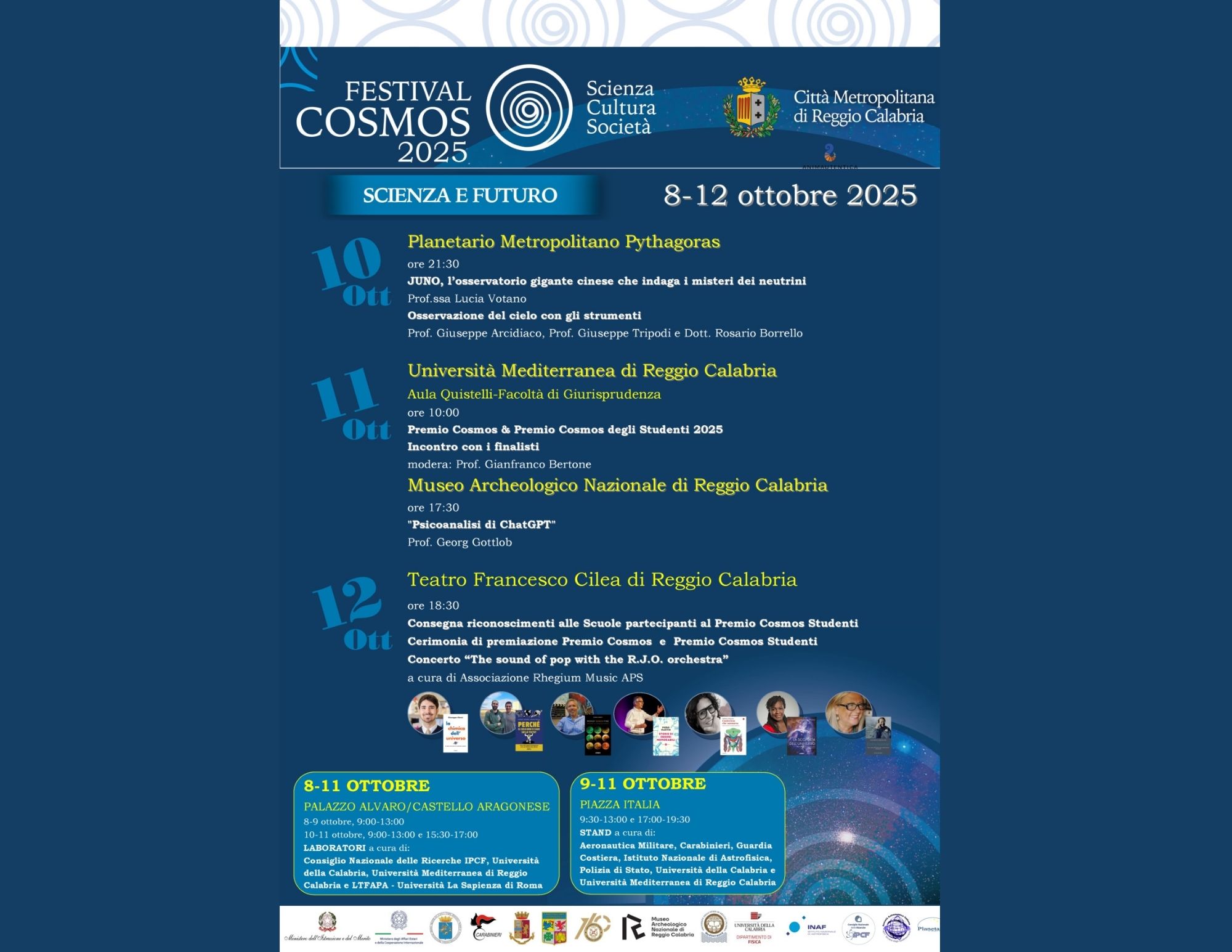 Ruolo fondamentale quello del Planetario Pythagoras della Città Metropolitana che ospiterà lo stage per gli studenti. Il festival Cosmos è suddiviso in due categorie: il ‘Premio Cosmos’ e il ‘Premio Cosmos studenti’; per questa ultima categoria lo scorso 29 settembre gli studenti, riuniti in assemblea, hanno decretato il vincitore che sarà comunicato il 12 ottobre.