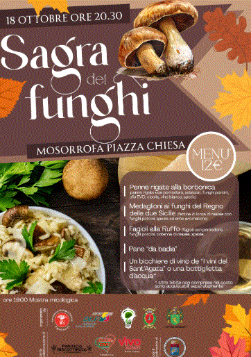 Alle 20.30 si terrà invece la Sagra dei Funghi. Dopo anni ritorna uno degli eventi più importanti per il nostro paese, un appuntamento che in passato ha deliziato molti, rappresentando e facendo conoscere le tradizioni culinarie del nostro territorio. Verrà allestita una Mostra Micologica con esperti micologi che spiegheranno i rischi legati al consumo dei funghi e le differenze tra specie eduli e quelle tossiche, e si potrà poi gustare un menù speciale, storicamente corretto, a base delle prelibatezze autunnali della nostra terra.