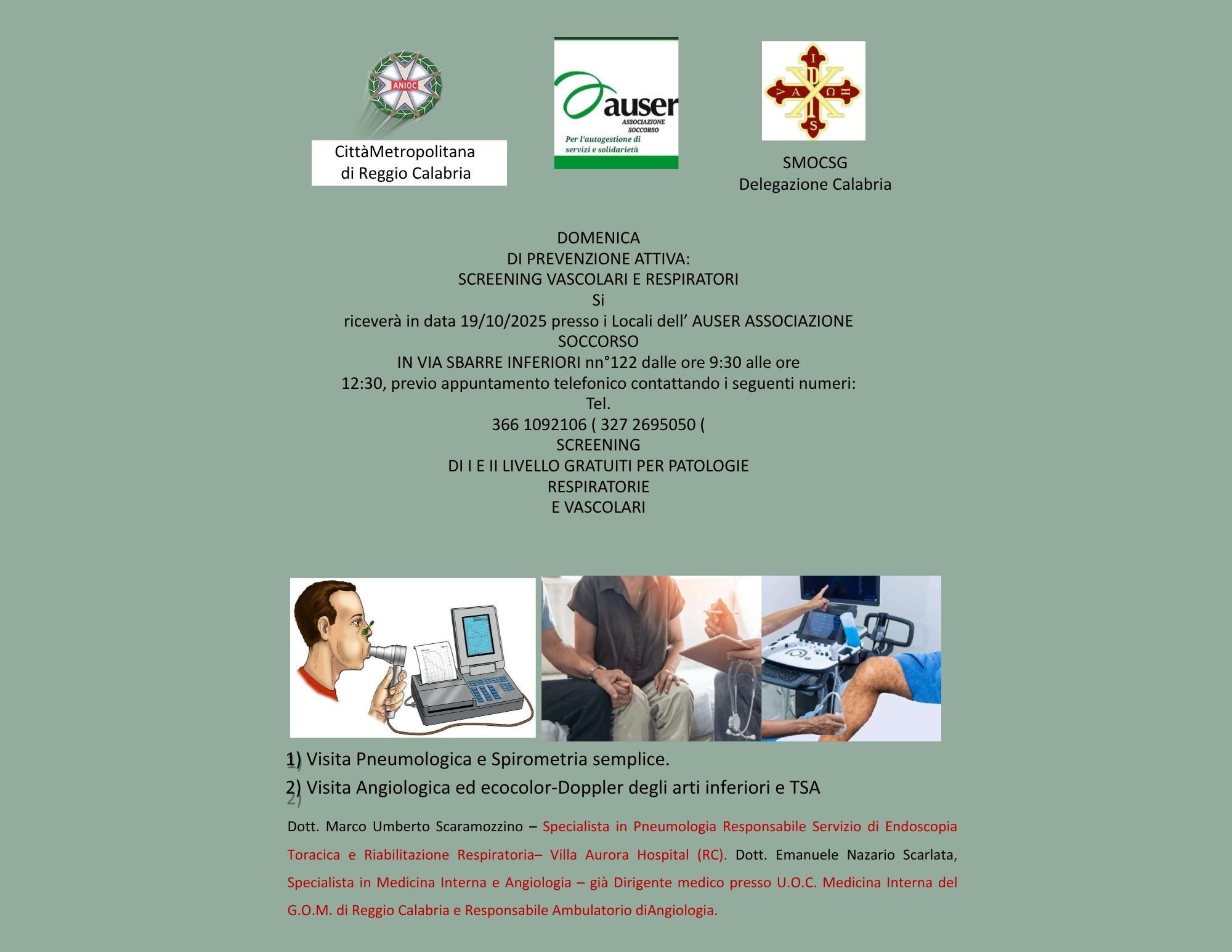 La giornata sarà condotta da due medici di altissimo profilo, impegnati da anni nella promozione della salute pubblica ovvero il Dottor Marco Umberto Scaramozzino, Specialista in Pneumologia, Responsabile del Servizio di Endoscopia Toracica e Riabilitazione Respiratoria presso Villa Aurora Hospital, e  il Dottor Emanuele Nazario Scarlata, Specialista in Medicina Interna e Angiologia, già dirigente medico presso l’U.O.C. Medicina Interna del G.O.M. di Reggio Calabria e attuale Responsabile dell’Ambulatorio di Angiologia.