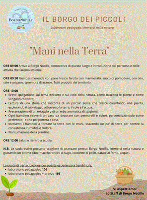 Con il laboratorio “Mani nella terra”, i bambini riscoprono, infine, il legame più profondo con la natura. Creano un mini orto in vaso, riconoscono ortaggi e piante aromatiche, imparano il ciclo della vita attraverso storie e attività creative.