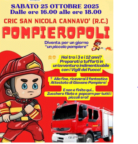 Sabato 25 ottobre, dalle ore 16:00 alle 18:00, il Centro ricreativo “Cric San Niciola” ospiterà la seconda edizione di Pompieropoli, l’iniziativa ludico-educativa che permette ai bambini di vivere per un giorno l’esperienza di essere “piccoli vigili del fuoco”.