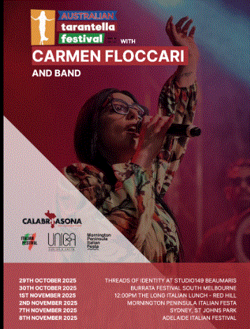 L’Australian Tarantella Festival annuncia con entusiasmo le prime date per l’edizione 2025 che toccheranno Melbourne, Adelaide e Sidney. Ecco i principali appuntamenti: 30 Ottobre Burrata Festival Melbourne – 02 Novembre Monrnington Peninsula Italiana Festa – Rosebud VIC – 7 Novembre Sidney Festa Italia – 8 Novembre Adelaide italian Festival. Tutte le info possono essere trovate su www.australiantarantellafestival.com.