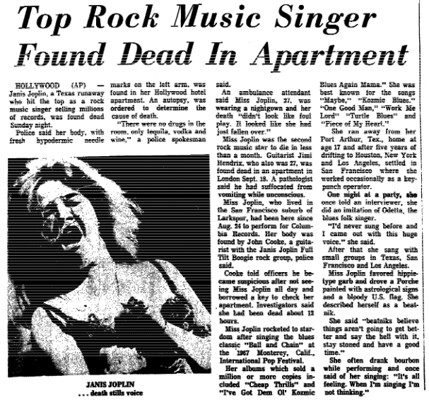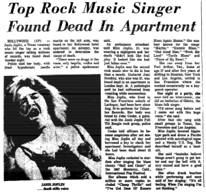 “Janis gettò sul letto le sigarette e si liberò di camicetta e slip. Poi, rapida come l’esplosione di un proiettile nel cervello, la morte la colpì, buttandola sul pavimento. Cadde così brutalmente che si spaccò il labbro inferiore contro un mobile e la bocca le si riempì di sangue. Atterrò tra il letto e una sedia, e restò li distesa per tutta la notte e la più parte del giorno seguente. Il suo corpo venne scoperto solo alle 19,30 di domenica 4 ottobre- 18 ore dopo il decesso”.
