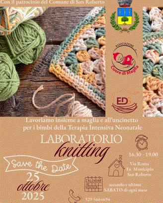 In questo contesto si inquadra l’iniziativa messa in campo tra l’associazione “Nido dei Nonni” e l’associazione “Cuore di Maglia”, con il patrocinio del Comune di San Roberto. Infatti, a partire dal 25 ottobre, il secondo ed ultimo sabato di ogni mese, le associazioni daranno vita ad un “laboratorio knitting”, dedicandosi alla creazione di lavorazioni a maglia e all’uncinetto per la Terapia Intensiva Neonatale.