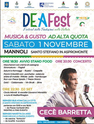 Chiusura col botto per il DEAFest 2025: la “ciliegina sulla torta” sarà CECÈ BARRETTA. Quella di SABATO 1 NOVEMBRE a Mannoli di Santo Stefano in Aspromonte sarà infatti la tappa finale per questa edizione, che per la prima volta ha esteso i suoi confini temporali all’autunno, facendo ballare e cantare le piazze delle Vallate del Gallico e del Catona ben oltre il mese di agosto. E l’ultima delle 10 tappe di quest’anno ne sarà il culmine. Barretta, noto ormai in tutta Italia (e anche oltre) per le sue canzoni che celebrano la Calabria, è senza dubbio tra i principali punti di riferimento della musica popolare nazionale. La sua crescente popolarità fa registrare numeri incredibili ad ogni concerto, caratterizzato da canzoni ispirate all’identità calabrese, alla sua gente, alle tradizioni, alla cultura locale, alla storia, spesso mescolando al folk influenze di flamenco, dando una forte impronta narrativa al suo modo di fare musica. Il successo di Cecè Barretta, infatti, è dovuto anche alla sua abilità nel raccontare storie attraverso la musica.