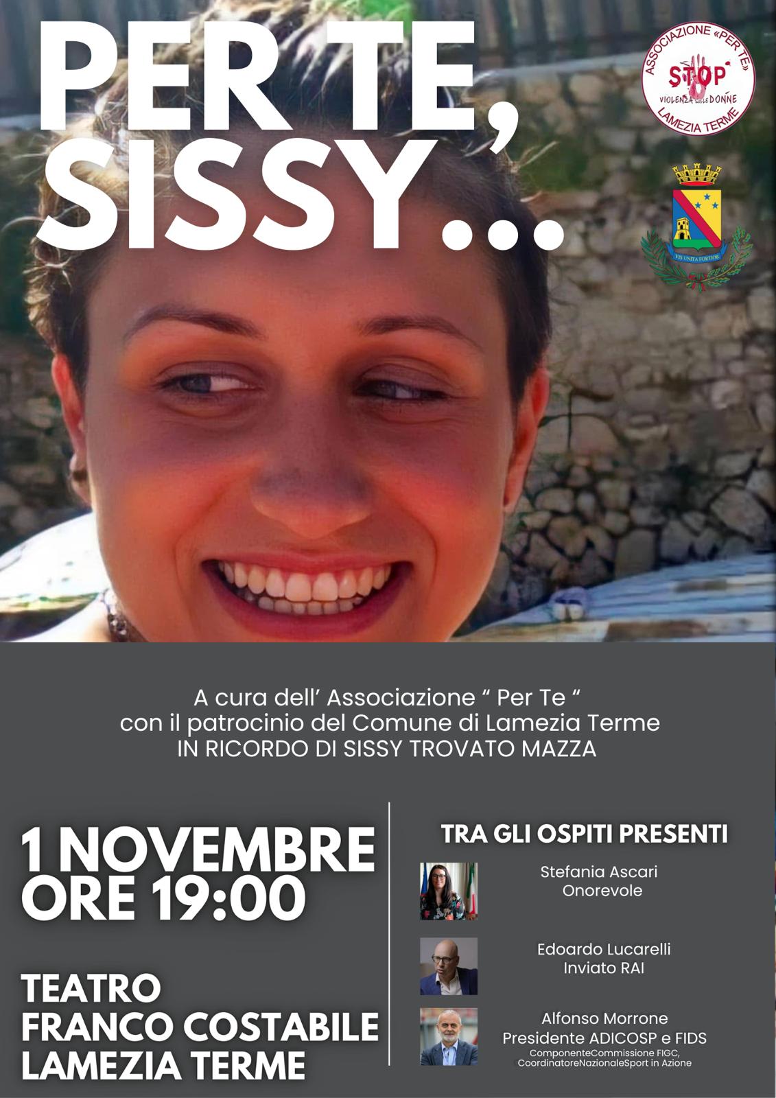 Nella serata, condotta dalla regista teatrale Tiziana De Matteo con la giornalista Tiziana Bagnato, verrà ricordata Sissy e rianalizzato il caso con i contributi dei familiari, del giornalista Rai Edoardo Lucarelli, della parlamentare Stefania Ascari ( entrambi in remoto), del presidente Adicosp – Associazione Direttori e Collaboratori Sportivi Calcio Alfonso Morrone.