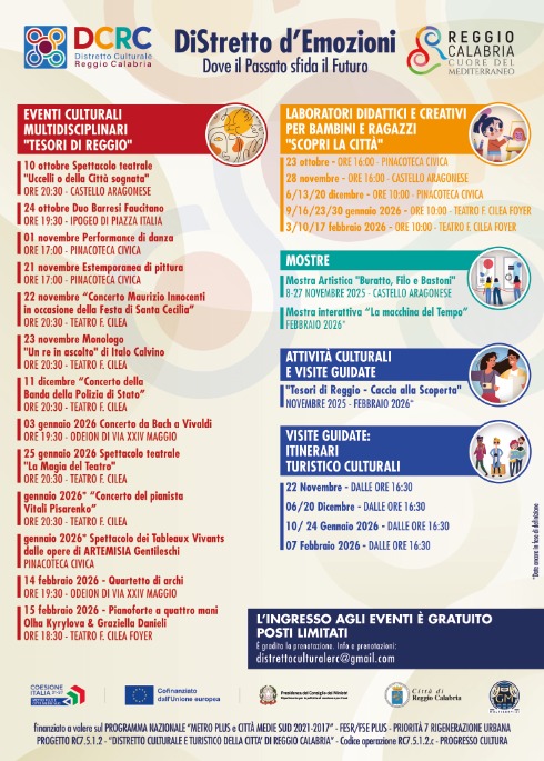 Promosso dalla Città di Reggio Calabria – Settore Sviluppo Economico, Cultura e Turismo, DiStretto d’Emozioni è un progetto finanziato nell’ambito del Programma Nazionale “Metro Plus e Città Medie Sud 2021-2027” – FESR/FSE Plus – Priorità 7 Rigenerazione Urbana. Denominato Progetto RC7.5.1.2 “Distretto Culturale e Turistico della Città di Reggio Calabria” (Codice operazione RC7.5.1.2.c “Progresso Cultura”), con l’obiettivo di rafforzare il legame tra rigenerazione urbana, cultura e turismo. Il progetto è stato programmato dal Settore Cultura e Turismo e la ditta GM Multiservizi SRLS, in A.T.I. con Emmedue Group SRL, è stata incaricata della realizzazione delle attività progettuali.