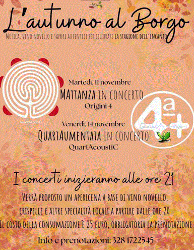 Due serate speciali l’11 e il 14 novembre, con concerti dei Mattanza e dei QuartAumentata, tra vino novello e i sapori della tradizione