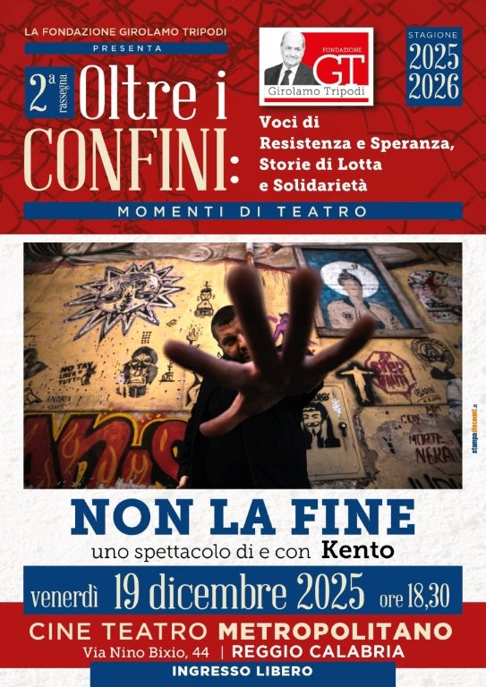 “Non la fine” è un racconto teatrale che unisce narrazione civile e rap dal vivo per restituire al pubblico un’immagine profonda, contraddittoria e inedita di Reggio Calabria. Non è uno spettacolo su una città, ma una riflessione sul Sud, sul Mediterraneo, sulle radici e sulle fratture che ci attraversano. Una dichiarazione d’amore e di conflitto, scritta in prima persona e restituita con voce, corpo e musica da Kento, rapper, autore e attivista da anni impegnato tra cultura e marginalità.