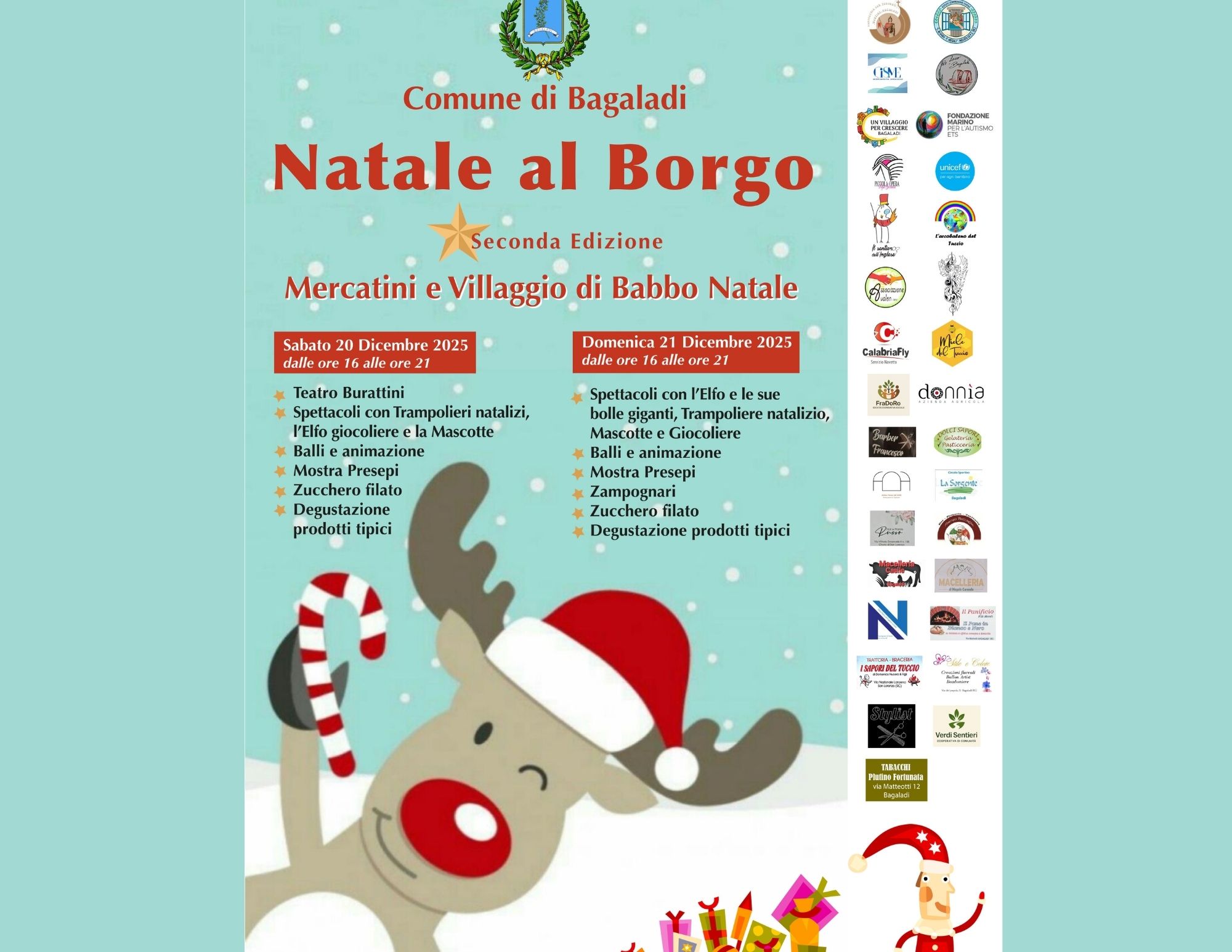 A Bagaladi, il 20 e 21 dicembre, dalle ore 16.00 alle 21.00, un percorso di tante delizie gastronomiche, manufatti artigianali, attrazioni, musica, balli nonchè la casa di Babbo Natale addobbata a festa con i suoi Elfi.