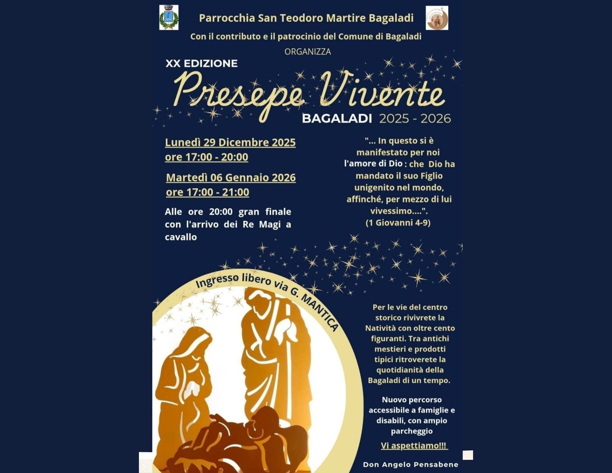 Lunedì 29 dicembre, dalle 17 alle 20, e martedì 6 gennaio 2026, dalle 17 alle 21, a Bagaladi, nelle vie del centro storico, verrà rappresentato il Presepe Vivente.