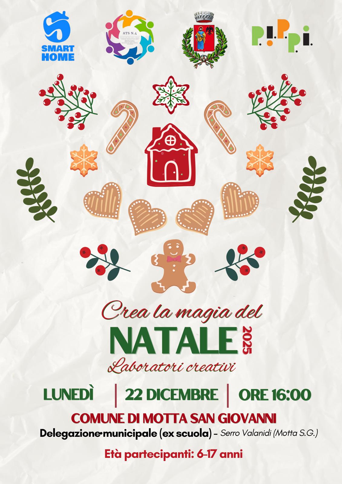 Il Comune di Motta San Giovanni e l’Ambito Territoriale Sociale N.4- Capofila Melito di Porto Salvo, in collaborazione con gli operatori del Progetto P.I.P.P.I. e l’associazione Virtus San Paolo, invitano grandi e piccini a partecipare al laboratorio creativo natalizio in programma a Serro Valanidi.