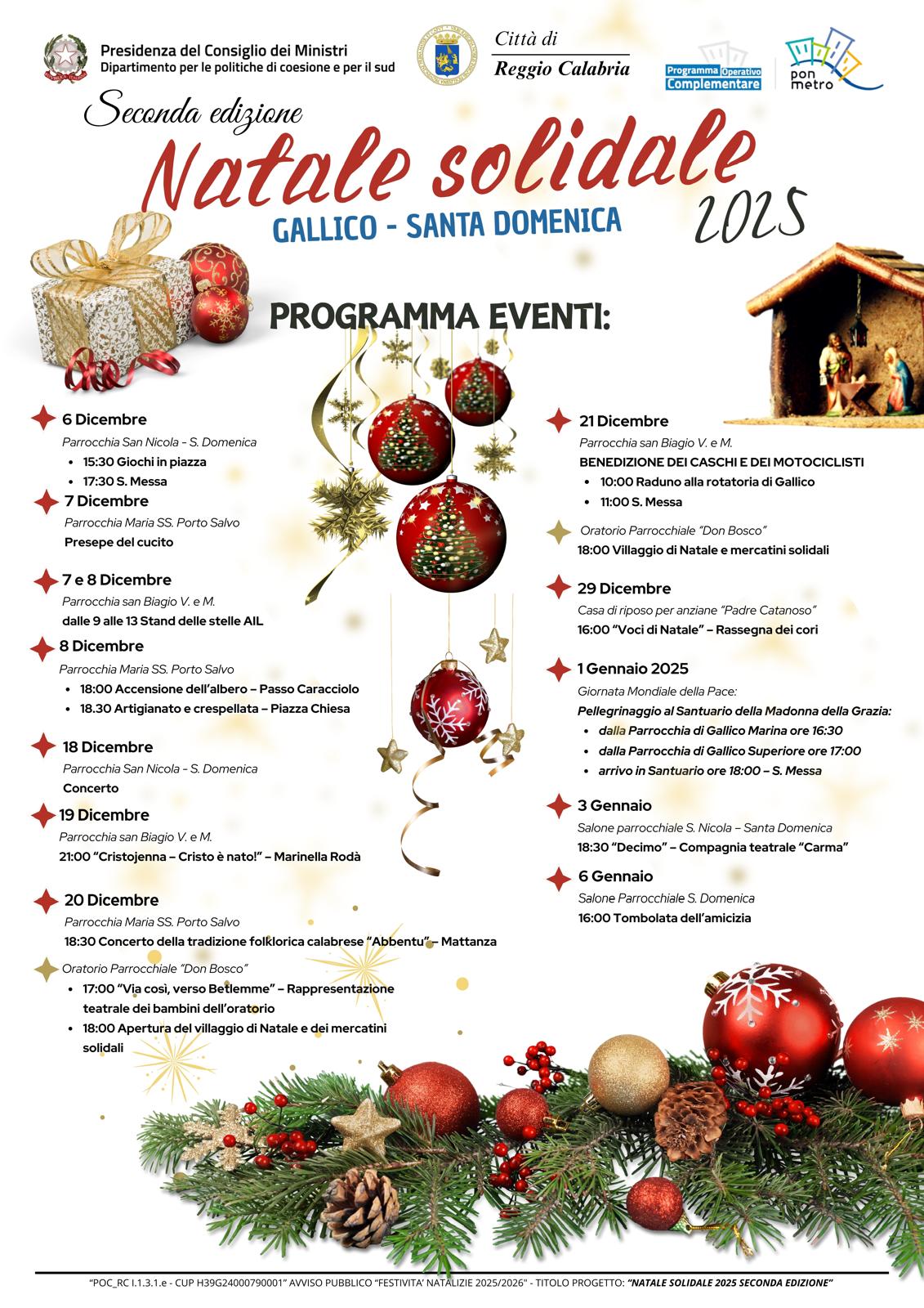 Il “Natale Solidale” di Gallico è giunto alla sua seconda edizione e si conferma un appuntamento atteso e partecipato, capace di unire generazioni diverse e di trasformare il periodo natalizio in un’occasione concreta di fraternità, tradizione e attenzione verso il prossimo.