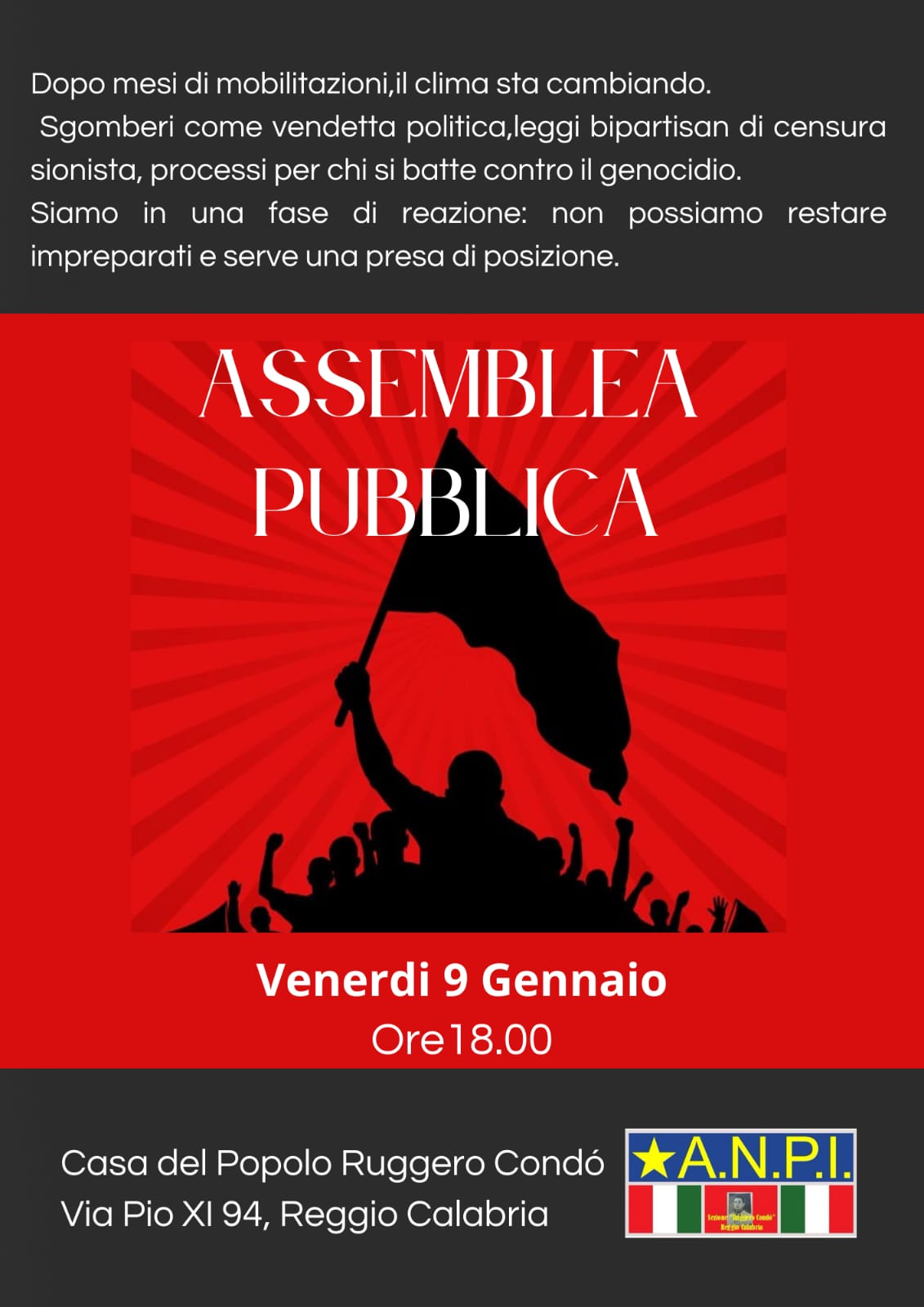 “Venerdì 9 gennaio, alle ore 18:00, presso la Casa del Popolo Condò, la cittadinanza è chiamata ad un’assemblea pubblica.