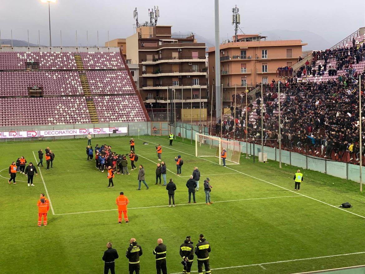 14.32: partiti! La Reggina attacca dalla sinistra rispetto alla tribuna centrale.