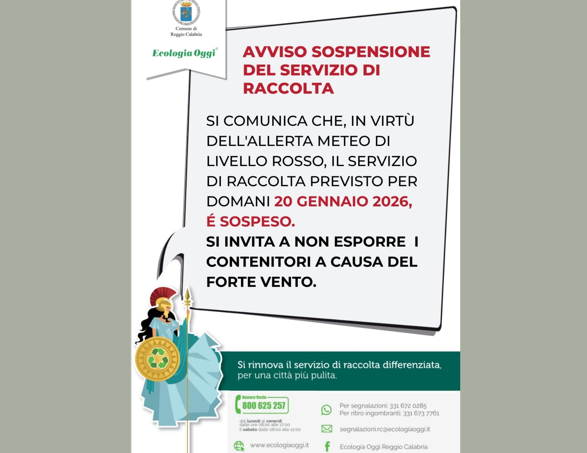 Il Comune di Reggio Calabria ed Ecologia Oggi Spa informano la cittadinanza che, in virtù dell’allerta meteo di livello “rosso” diramata dalla Protezione civile regionale per possibili precipitazioni intense, il servizio di raccolta differenziata previsto per la giornata di domani (20 gennaio 2026) è sospeso.