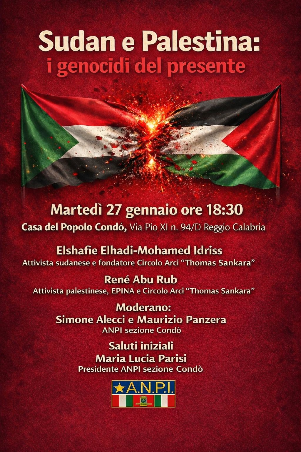 “Martedì 27 gennaio alle ore 18:30 presso la Casa del Popolo Condò, in occasione della Giornata della Memoria, parleremo di ricorsi della storia: il genocidio in Sudan e Palestina.