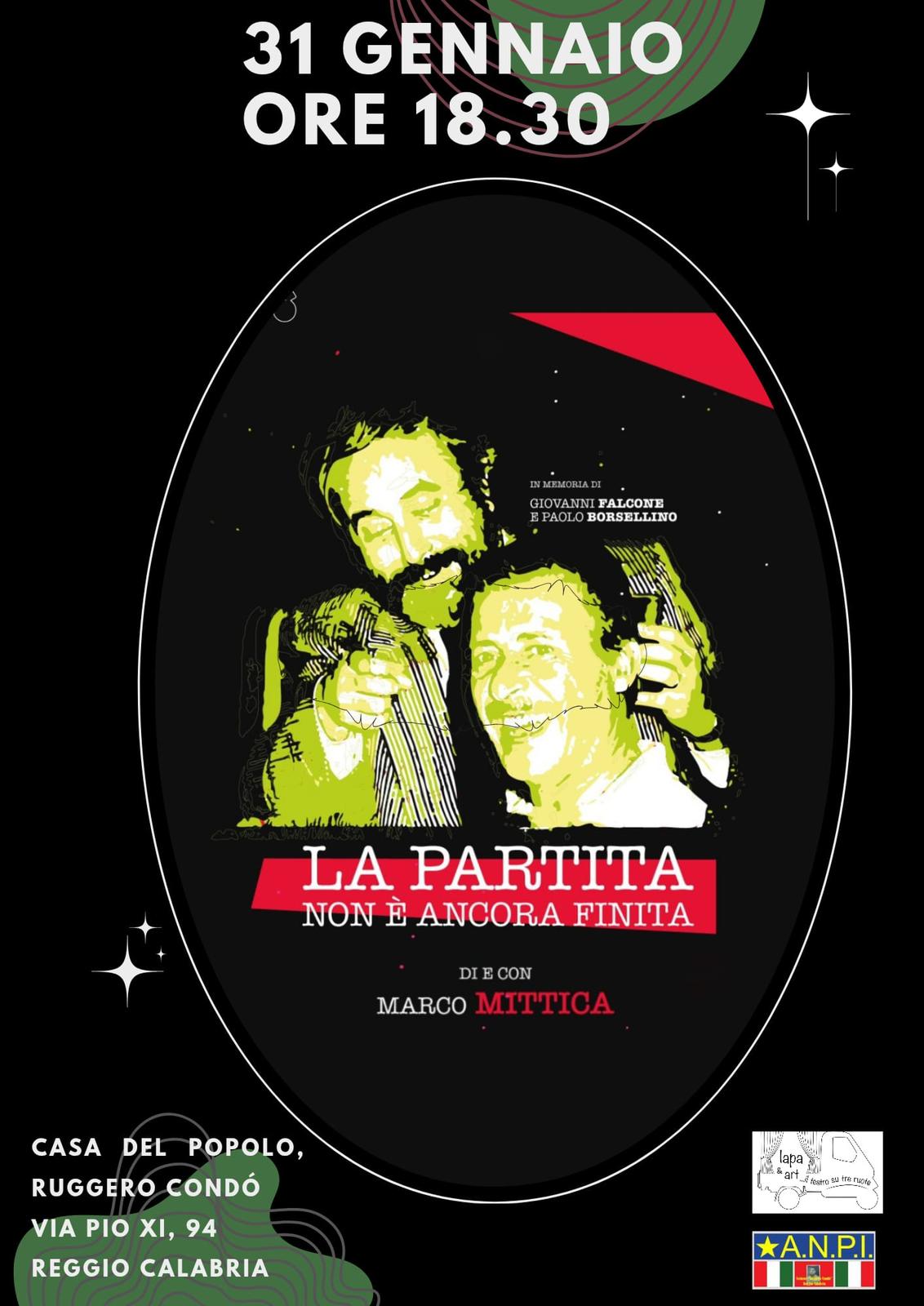 Sabato 31 gennaio alle ore 18:30 presso la Casa del Popolo Condò va in scena lo spettacolo “La partita non è ancora finita”, di e con Marco Mittica, un racconto teatrale che restituisce voce, umanità e forza civile alle figure di Giovanni Falcone e Paolo Borsellino.