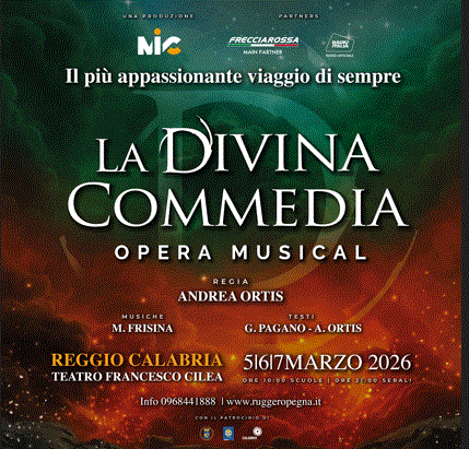 E’ febbre dantesca a Reggio e in tutta la Calabria per l’arrivo del colossal La Divina Commedia Opera Musical, in scena dal 5 al 7 marzo al Teatro Francesco Cilea, con due repliche al giorno: alle ore 10:00 per le scuole e alle ore 21:00 per tutti. Prodotta dalla Mic International Company, l’evento è organizzato dalla Rps di Ruggero Pegna nell’ambito del suo progetto “Opere d’Arte”, lo speciale format con cui propone colossal musicali legati ad Opere Letterarie e Personaggi dell’Arte, con il Patrocinio e il contributo della Regione Calabria, brand  Calabria Straordinaria (POC 2014/ 2020 – Az. 6.8.3).