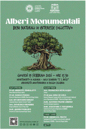 Proprio per questo assume un significato ancora più importante l’iniziativa promossa dal Dipartimento di Agraria dell’Università Mediterranea di Reggio Calabria per Giovedì 19 febbraio 2026 Ore 15.30. Il seminario tecnico–divulgativo: “Alberi Monumentali: beni naturali di interesse collettivo”.