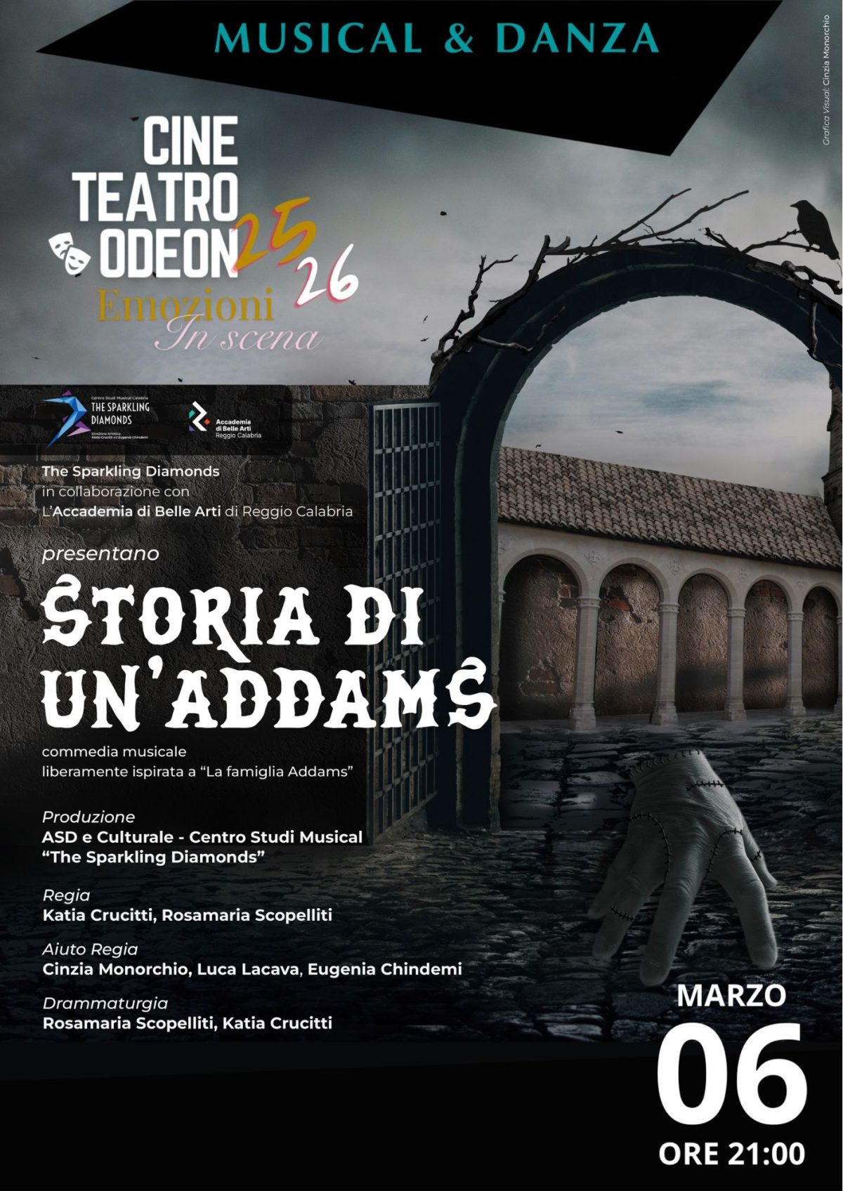 Il 6 marzo, alle 21:00, al Cine Teatro Odeon, andrà in scena una commedia musicale ispirata al mondo della Famiglia Addams, realizzata dalla compagnia “The Sparkling Diamonds”, diretta da Katia Crucitti ed Eugenia Chindemi.