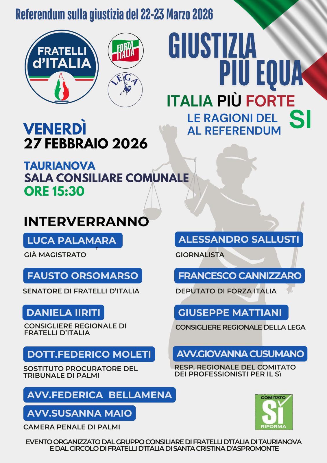 Taurianova per un pomeriggio si trasformerà in crocevia del dibattito nazionale sulla riforma della giustizia. Venerdì 27 febbraio, alle ore 15:30, la Sala Consiliare Comunale ospiterà l’incontro “Giustizia più equa, Italia più forte Le ragioni del Sì al Referendum”, promosso dal circolo cittadino di Santa Cristina d’Aspromonte e dal gruppo consiliare di Fratelli d’Italia.
