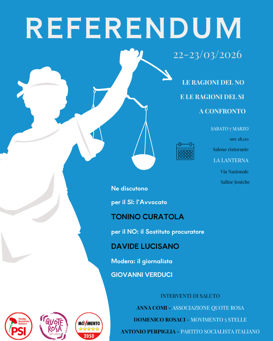 In vista del referendum previsto per i giorni 22 e 23 marzo 2026, si terrà sabato 7 marzo alle ore 18.00, presso il salone del ristorante La Lanterna, in Via Nazionale a Saline Joniche, un incontro pubblico di approfondimento dal titolo “Referendum: le ragioni del No e le ragioni del Sì a confronto”.