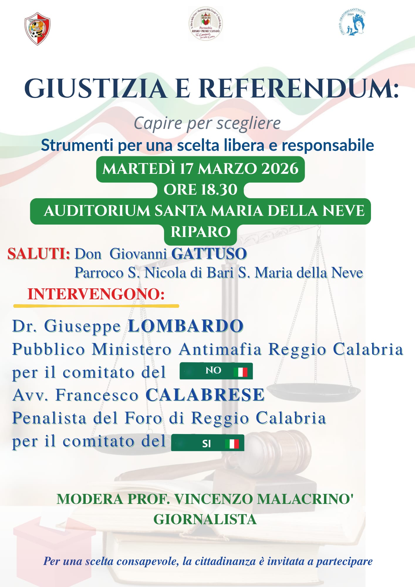 – martedì 17 marzo, ore 18:30, Riparo, Auditorium S. Maria della Neve – “Giustizia e referendum: capire per scegliere”;