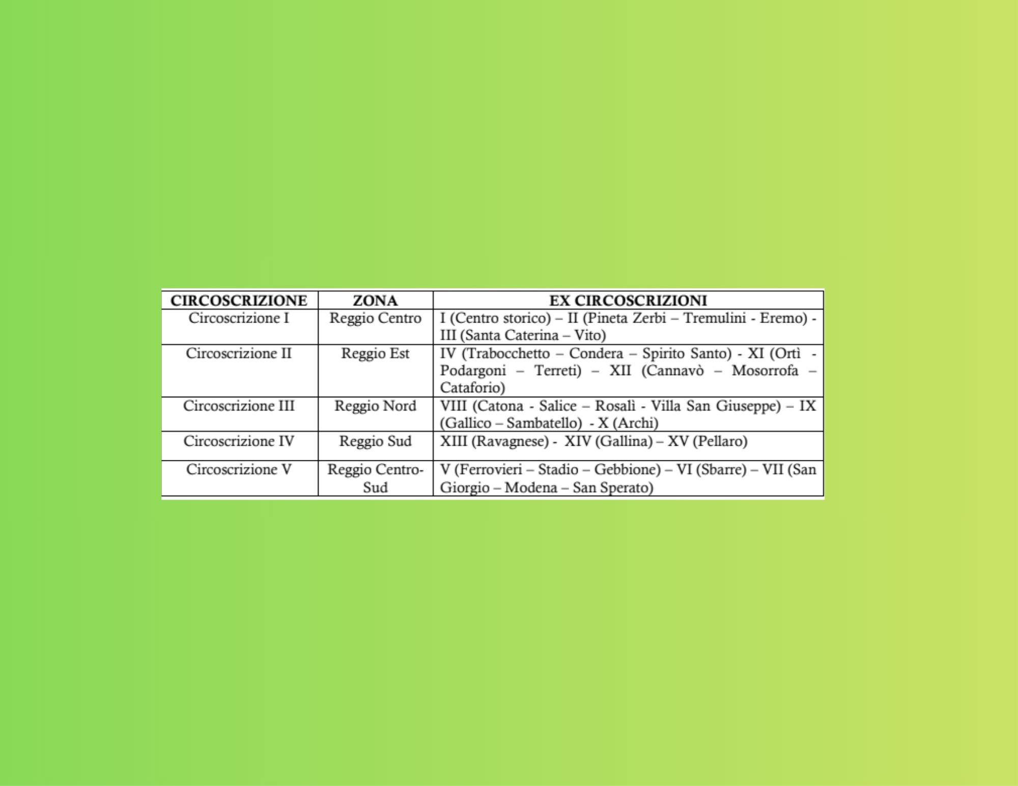 Il Regolamento definisce l’assetto del decentramento amministrativo del Comune di Reggio Calabria articolando il territorio in cinque Circoscrizioni.