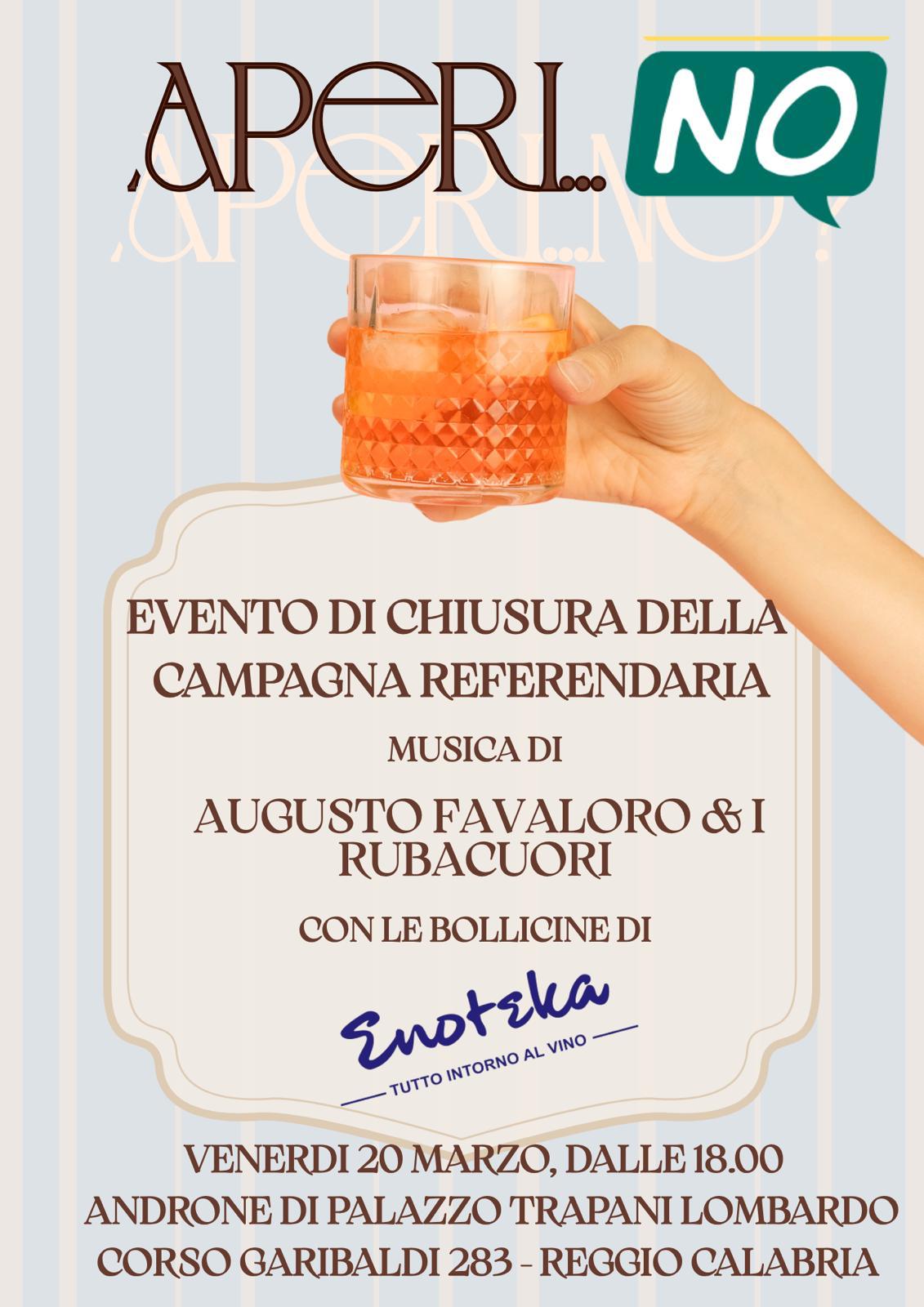 Si svolgerà domani, dalle 18:00, presso il cortile della Libreria AVE Ubik, sul Corso Garibaldi di Reggio, l’evento conclusivo della campagna referendaria del Comitato cittadino “Giusto dire NO”, intitolato “Aperi-NO”.