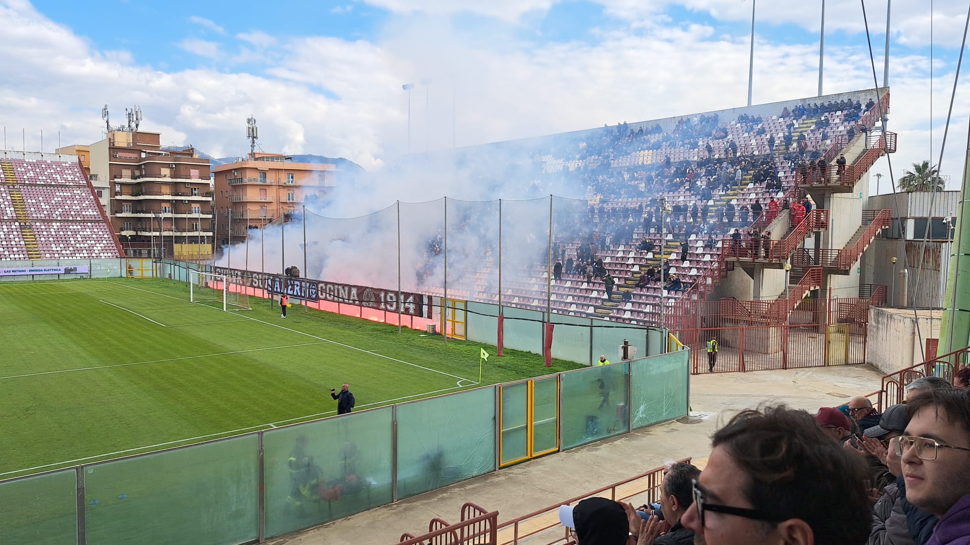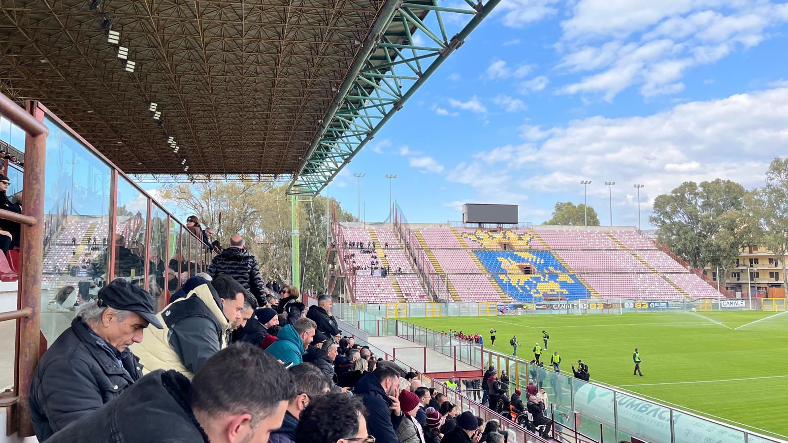14.38: si parte. La Reggina attacca dalla sinistra rispetto alla nostra postazione in tribuna.