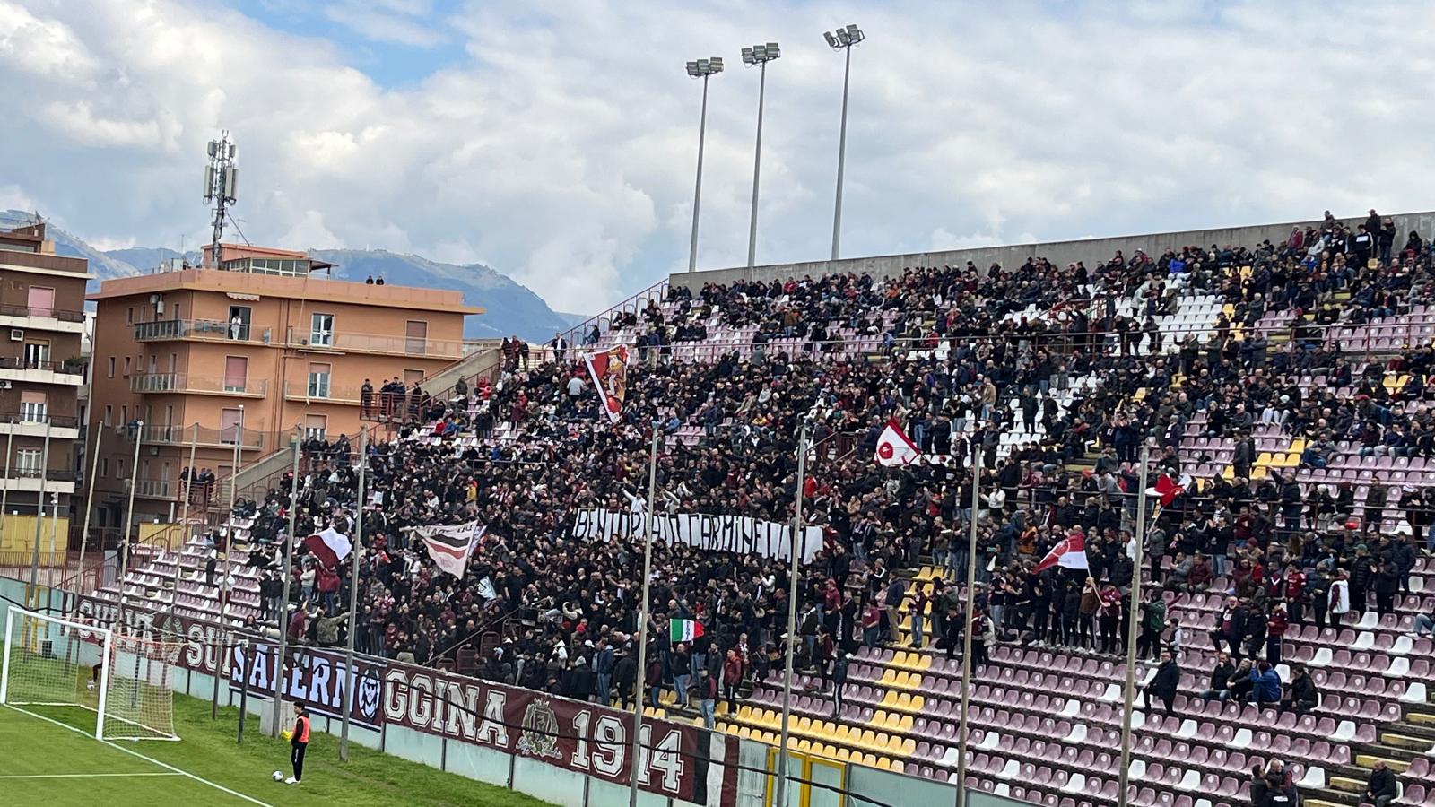 14.30: la Curva saluta con uno striscione e cori il ritorno di Carminello allo stadio.