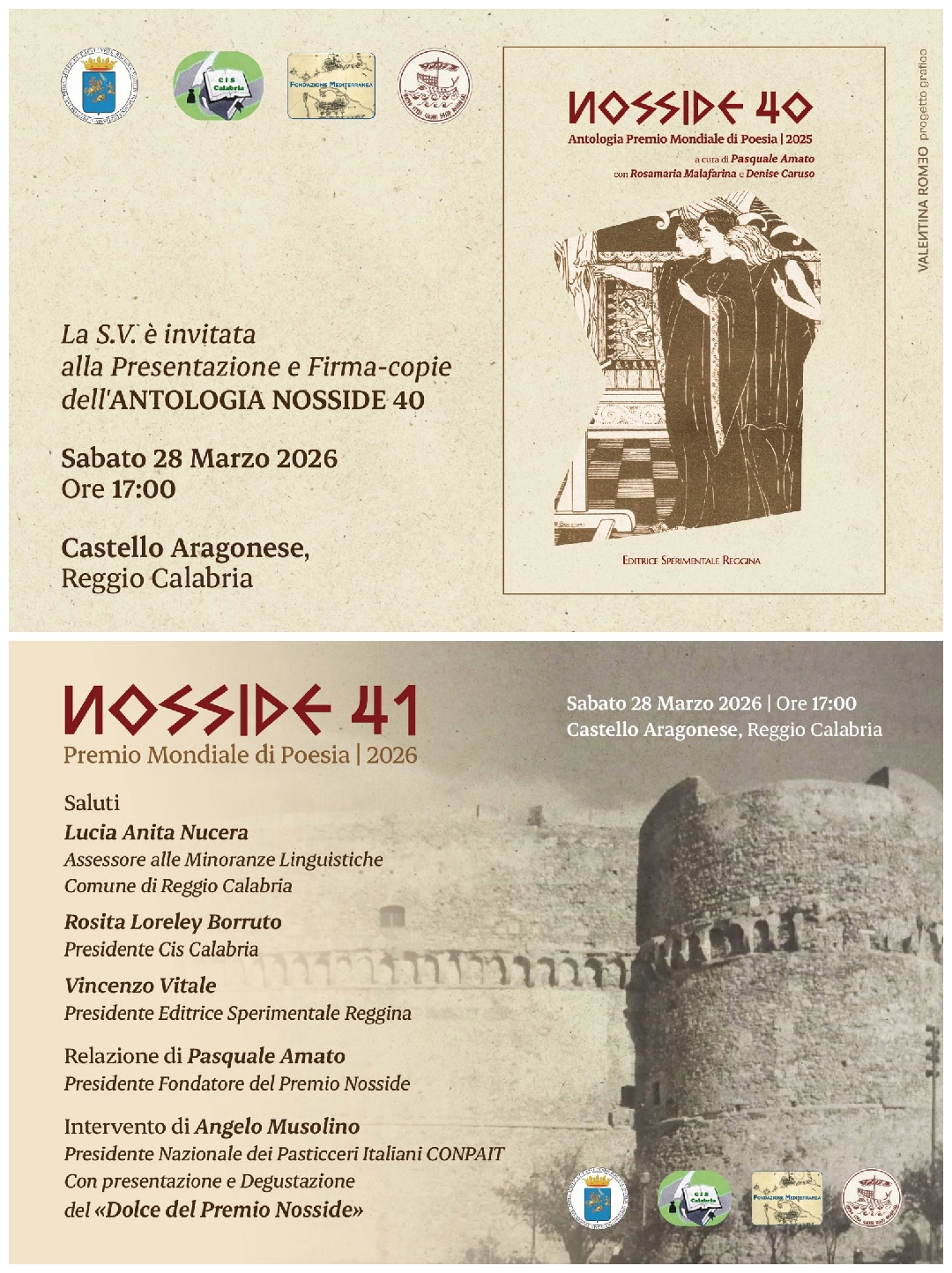 L’Incontro sarà concluso dal firma-copie dell’Antologia e dalla presentazione e degustazione del “Dolce del Premio Nosside” creato dal Maestro Pasticcere reggino Angelo Musolino, presidente Nazionale dei Pasticceri Italiani Conpait. Dolce che ha avuto il suo felice battesimo nell’Evento del 3 aprile 2025 presso il Consolato Generale d’Italia a Londra.