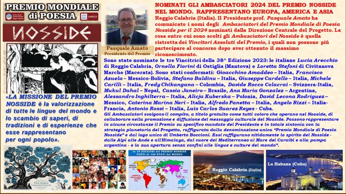 Il Presidente prof. Pasquale Amato ha comunicato i nomi degli Ambasciatori del Premio Mondiale di Poesia Nosside per il 2024 nominati dalla Direzione Centrale del Progetto . La rosa entro cui sono scelti gli Ambasciatori del Nosside è quella ristretta dei Vincitori Assoluti del Premio, i quali non possono più partecipare al concorso dopo aver ottenuto il massimo riconoscimento.