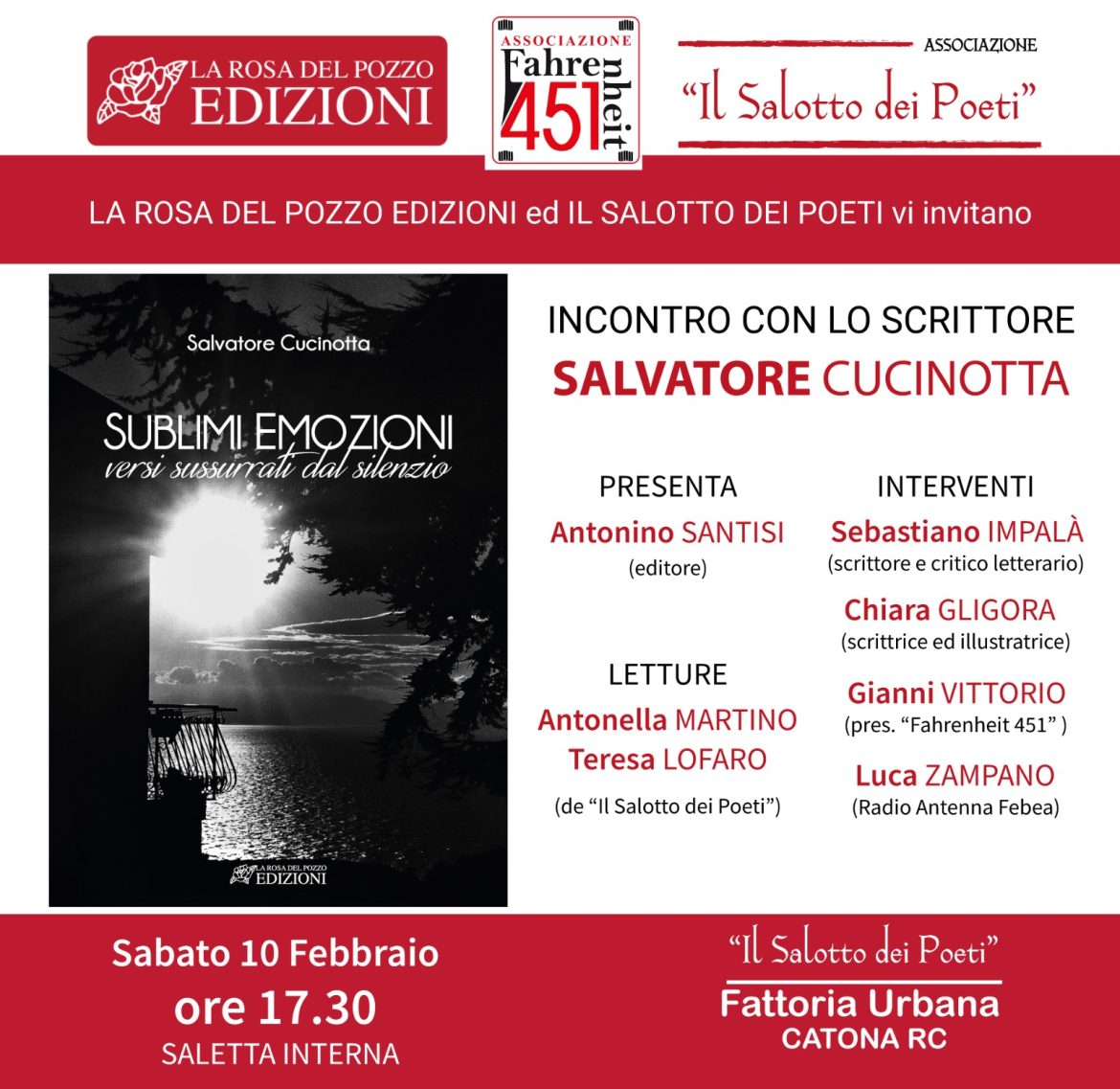 Sabato 10 febbraio 2024 alle 17.30 presso La Rosa Del Pozzo Edizioni alla Fattoria Urbana di Catona avrà luogo la presentazione del nuovo lavoro dello scrittore calabrese Salvatore Cucinotta, dal titolo “Sublimi Emozioni”. Poeta e autore ha affascinato il pubblico con la sua precedente opera, “Étiennette Liberi Pensieri”, il cui esordio ha segnato l’inizio di una carriera letteraria ricca di riconoscimenti e consensi anche a livello nazionale. Il suo primo libro, pubblicato anch’esso da La Rosa Del Pozzo Edizioni, è stato realizzato in collaborazione con l’amico fotografo Gianni Vittorio ed ha suscitato un ampio consenso grazie alla sua poliedricità e raffinatezza. Il nuovo capitolo della sua produzione poetica, “Sublimi Emozioni”, rappresenta quindi un viaggio emozionante e personale che fonde poesia e riflessioni profonde. Attraverso versi liberi e suggestivi, l’autore esplora con maestria le sottili sfumature dell’esistenza umana, offrendo al lettore un’esperienza coinvolgente e ricca di significato.