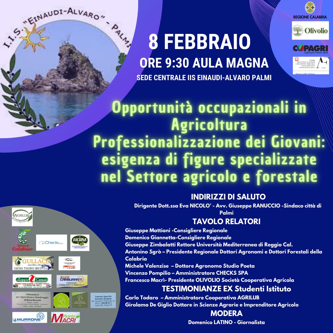 L’8 febbraio alle 9:30 presso l’Aula Magna dell’I.I.S. “Einaudi-Alvaro” si terrà il convegno “Opportunità occupazionali in Agricoltura. Professionalizzazione dei Giovani: esigenza di figure specializzate nel Settore agricolo e forestale”. Dopo i saluti istituzionali della DS Eva Raffaella Nicolò e del sindaco di Palmi, l’avvocato Giuseppe Ranuccio, relazioneranno sul tema una serie di figure fortemente impegnate nei loro settori di competenza per favorire lo sviluppo dell’imprenditoria agricola quale sbocco occupazionale per i giovani del nostro territorio: i consiglieri regionali Giuseppe Mattiani e Domenico Giannetta, il Rettore dell’Università Mediterranea di Reggio Calabria Giuseppe Zimbalatti, il presidente regionale dei dottori agronomi e dottori forestali della Calabria, il dottore agronomo Michel Valenzise, l’amministratore della Checks SPA Vincenzo Pompilio, il presidente della società cooperativa agricola OLIVOLIO Francesco Macrì. Saranno poi ascoltate le preziose testimonianze di ex allievi dell’ITA “Einaudi-Alvaro” di Palmi, Carlo Todaro, amministratore della cooperativa AGRILUB, e Girolamo de Giglio, dottore in Scienze Agrarie e imprenditore agricolo. Modererà l’incontro il giornalista Domenico Latino.