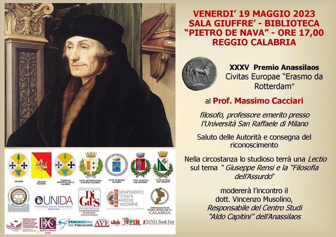 A Massimo Cacciari, filosofo contemporaneo tra i più significativi, e professore emerito di Filosofia presso l’Università San Raffaele di Milano, nonché pensatore politico che non ha mai temuto di confrontarsi, da amministratore (è stato Sindaco di Venezia) con la sempre complessa realtà del governare, venerdì 19 maggio con inizio alle ore 17,00 presso la Sala Giuffrè della Biblioteca “Pietro de Nava” di Reggio Calabria sarà conferito il Premio Anassilaos Civitas Europae “Erasmo da Rotterdam”. Studioso di F.W. Nietzsche, L. Wittgenstein, M. Heidegger e F. Kafka nonché profondo conoscitore della cultura viennese e mitteleuropea tra Ottocento e Novecento, egli si è ben presto trovato ad affrontare la crisi del pensiero dialettico della tradizione hegeliano-marxista, studiando gli autori e le culture sopra ricordati, ritenuti espressione di questa crisi, cercandone le ragioni profonde nella tradizione metafisica e teologico-religiosa dell’Occidente. Tra i prestigiosi riconoscimenti ricevuti si ricordano il premio Hannah Arendt per la filosofia politica nel 1999 e quello dell’Accademia di Darmstadt per la diffusione della cultura tedesca all’estero (2002) Il suo impegno intellettuale e politico – si legge nella motivazione del riconoscimento – si può ben concepire nello spirito nel Nomos – del Diritto – come tentativo di custodire, di conservare, di tenere “in forma” la contemporaneità sul baratro del destino di consunzione, nel dilagare dell’anomia e della barbarie. Per il filosofo qualsiasi esercizio autoreferenziale del potere, qualsiasi tentativo politico che non sia – esplicitamente o implicitamente – connesso ad un fine ultimo, appare inefficace, spiritualmente ‘sradicato’, irrealistico, disincarnato.