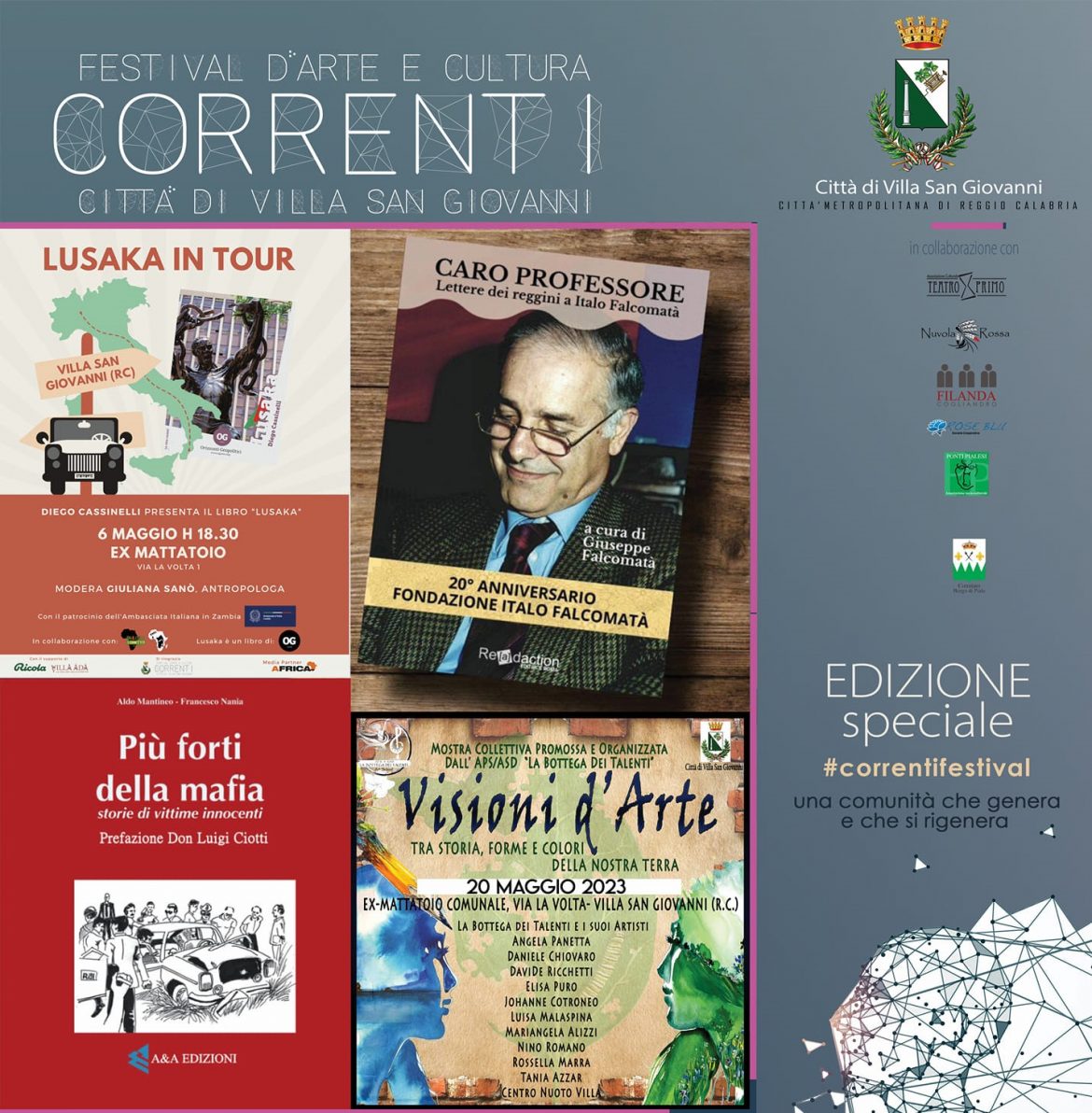 La prima stagione, dedicata all’editoria e alla lettura, con un calendario di eventi coinvolgente e ricco, si è posta come obiettivo quello di promuovere gli interessi culturali e ricreativi della cittadinanza. Questa edizione speciale, in coerenza con la precedente, proporrà alcuni incontri editoriali che si inaugureranno il 6 maggio con l’evento di portata nazionale “Lusaka”. Tematiche, protagonisti, esempi, luoghi, artisti di significato per coinvolgere, aggregando la comunità attorno a un progetto volto alla costruzione di un rinnovato senso di appartenenza. L’ultima settimana di giugno, un grande evento editoriale ed espositivo, concluderà e narrerà la nascita del nostro festival e farà da cornice a riflessioni e tavole rotonde. Un’anteprima delle future edizioni, che ci auguriamo possano avere un respiro sempre più ampio in termini di espressioni artistiche e culturali e di coinvolgimento del territorio. La seconda edizione del festival “CORRENTI”, si aprirà ufficialmente nella stagione autunnale 2023 il cui calendario si concerterà in collaborazione con le istituzioni scolastiche e le associazioni, proseguendo quanto già avviato con la partecipazione attiva di tutta la comunità cittadina.