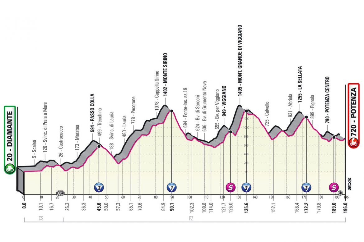 La settima frazione del Giro d’Italia partirà da Diamante per raggiungere Potenza e sarà tosta a causa dei 196 km. Tappa molto impegnativa attraverso l’appennino lucano. L’avvio lungo il mare costituisce l’unica parte pianeggiante. Dopo Maratea la sequenza di asperità, più o meno impegnative, è ininterrotta. Si scala il passo della Colla che porta a Lauria dove si affronta il Monte Sirino. Lungo raccordo con Viggiano dove si scala la breve e impegnativa Montagna Grande di Viggiano. Ultima salita Sellata per raggiungere Potenza. L’intero tracciato affronta strade in diverso stato manutentivo, mediamente ristrette con innumerevoli curve a seguire i fianchi della montagne. Gli ultimi chilometri saranno interamente in città. Si sale dentro il centro anche con pendenze elevate per ridiscendere lungo viali ampi e ben pavimentati. A 2 km dall’arrivo una breve galleria porta ai viali che conducono all’arrivo. Ultimi 350 m all’8% con punta massima del 13%. Arrivo sull’asfalto.
