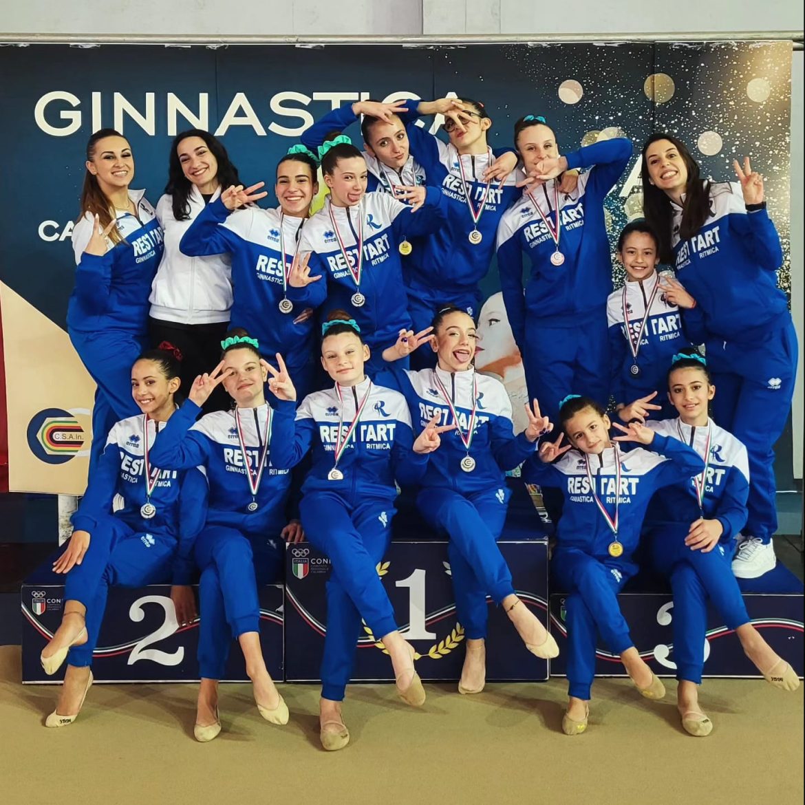 Prima tappa di un 2024 che si preannuncia ricco di appuntamenti e medaglie per la Restart Ginnastica Ritmica Reggio Calabria. La società della direttrice tecnica, prof.ssa Marilena D’Arrigo, ha preso parte domenica 25 febbraio, al campionato CSAIn disputatosi a Rossano e tornando a casa con ben 11 medaglie complessive. Il CSAIn (Centri Sportivi Aziendali e Industriali) è un ente di promozione sportivo, no-profit, riconosciuto dal Coni e la Restart ha partecipato per la prima volta a questo campionato.