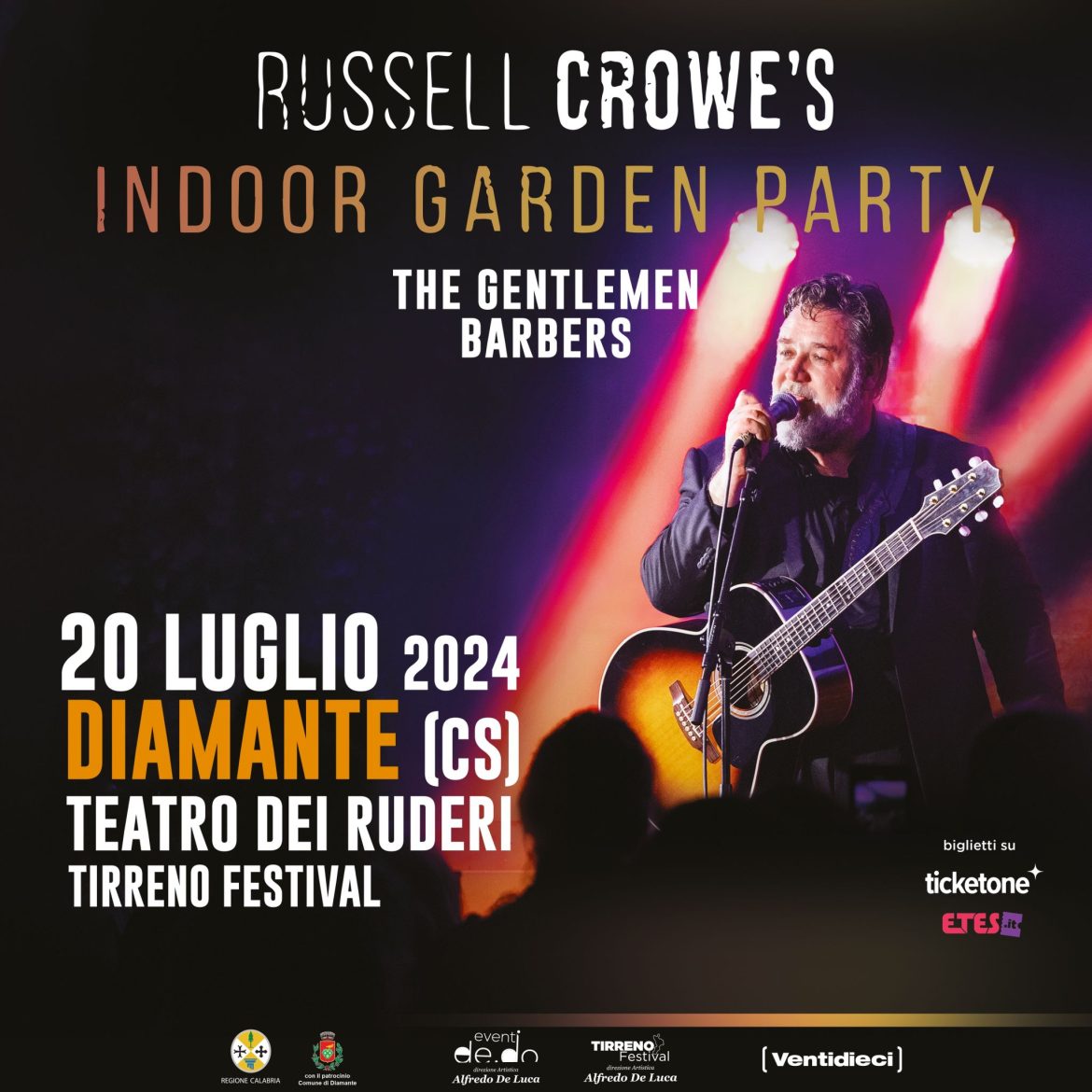 Appuntamento storico a Diamante con Russell Crowe il 20 luglio al Teatro dei Ruderi per l’unica tappa che una delle più grandi star del cinema terrà in Calabria insieme alla sua celebre band, Indoor Garden Party. Un live che si preannuncia epico per l’area archeologica di Cirella Antica. Uno show di livello internazionale che inaugurerà la programmazione estiva del Tirreno Festival. Russell Crowe, premio Oscar come miglior attore protagonista nel 2001 per “Il Gladiatore”, reduce dal grande successo al Festival di Sanremo, calcherà il palcoscenico più prestigioso e suggestivo della Riviera dei Cedri portando la sua grande passione per la musica. “Siamo onorati e orgogliosi, afferma il Vicesindaco Pino Pascale, di sapere che la nostra città ospiterà una star mondiale, un premio Oscar, in veste di musicista e frontman della sua band, così come lo abbiamo ammirato nell’ultimo festival di Sanremo”.