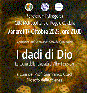 Domani, alle ore 21.00, al Planetario Pythagoras Città Metropolitana di Reggio Calabria, con un’appendice necessaria e ineludibile, si chiude la rassegna “Filosofia Quantistica”. Dopo aver attraversato i principali momenti caratterizzanti della meccanica quantistica, il professor Gianfranco Cordì, filosofo della scienza e curatore della rassegna, affronterà la teoria che ha rappresentato l’esatto contraltare di quella dei quanti d’azione di Planck. Il titolo dell’incontro, infatti, è indicativo: “I dadi di Dio. La teoria della Relatività di Einstein”.