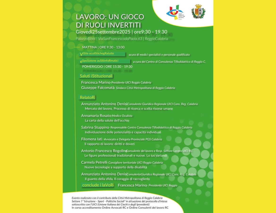 L’evento, intitolato “Lavoro: un gioco di ruoli invertiti”, si terrà giovedì 25 settembre 2025, dalle ore 9:30 alle ore 19:30, presso il Palazzo Bibbi, Via San Francesco da Paola 63 – Reggio Calabria.
