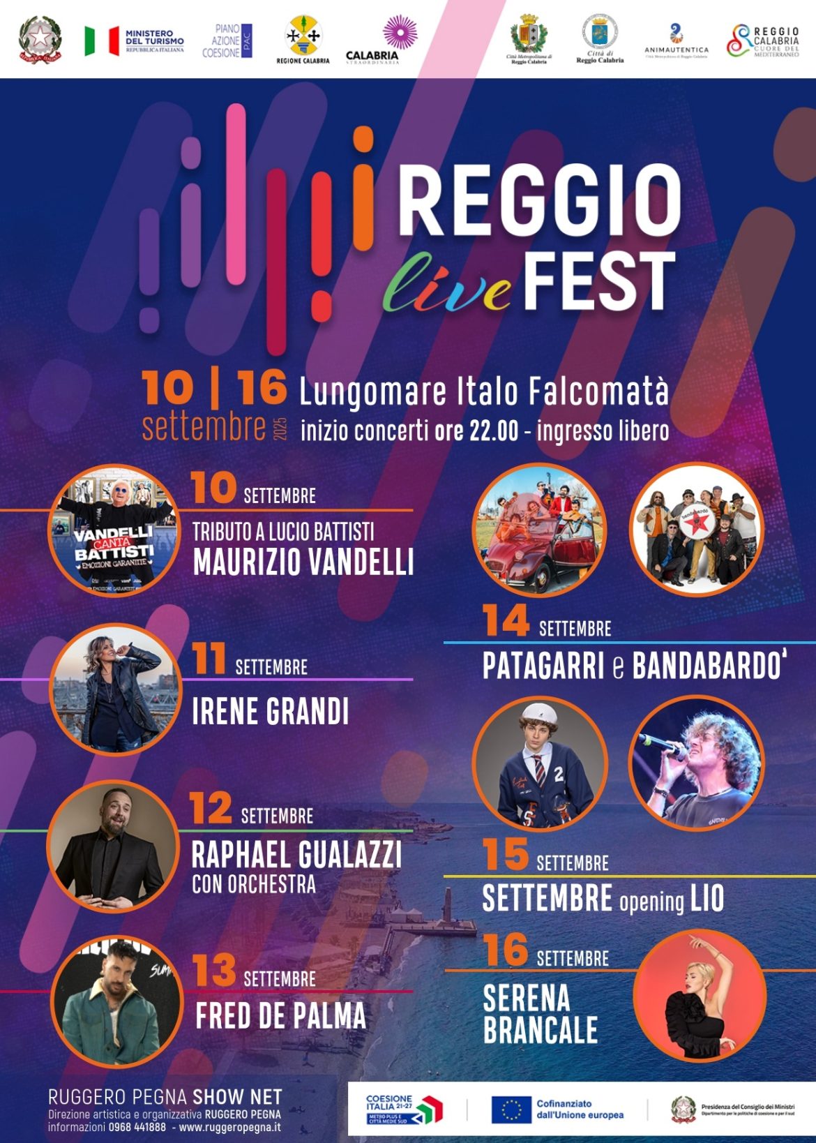 Dopo l’edizione da record dello scorso anno con oltre centomila presenze, torna il “Reggio Live Fest”, l’edizione 2025 del grande festival ideato e organizzato dalla Show Net di Ruggero Pegna con il contributo della Regione Calabria nel quadro degli “Eventi di Grande Interesse Turistico – Pac Calabria 2014 – 2020 – brand Calabria Straordinaria”, e la compartecipazione di Comune e Città Metropolitana di Reggio Calabria, rispettivamente con i brand Reggio Calabria Cuore del Mediterraneo ed Anima Autentica, per volontà del sindaco Giuseppe Falcomatà.