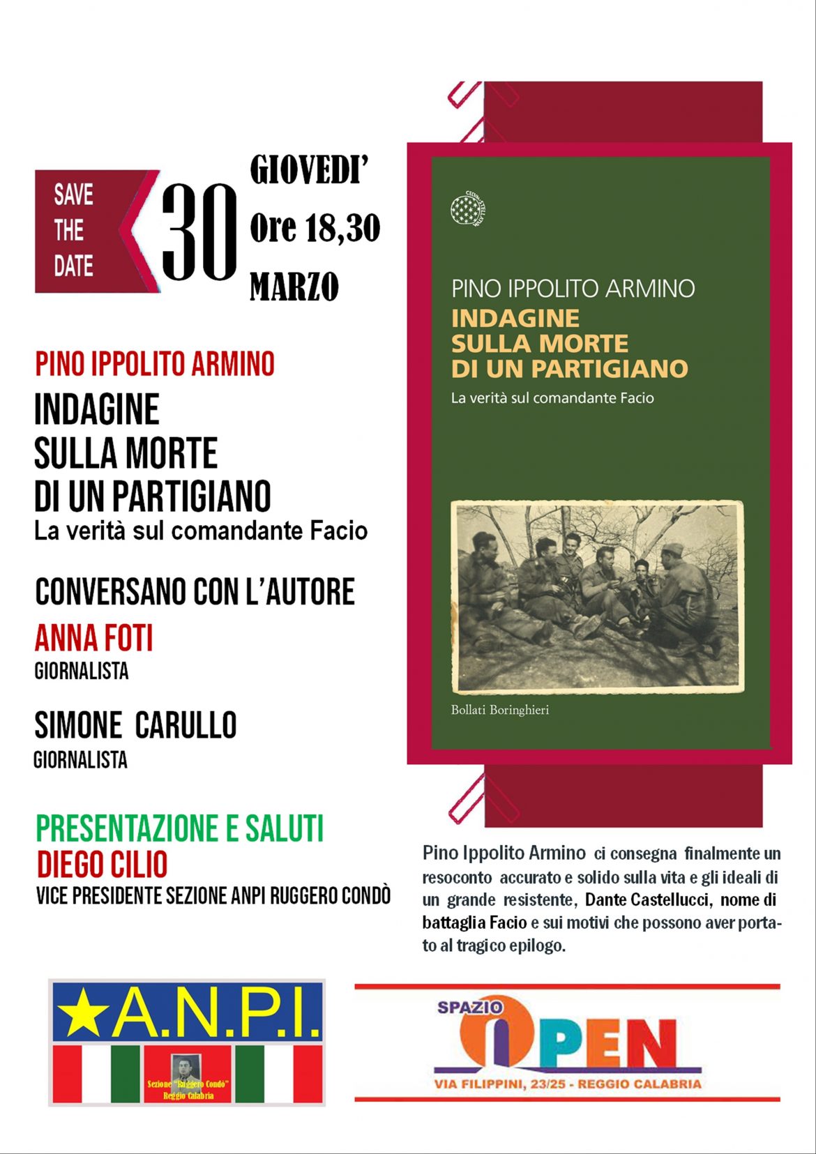 “Facio”, al secolo Dante Castellucci, fu un valoroso comandante partigiano calabrese crudelmente giustiziato all’alba del 22 luglio 1944 dai suoi compagni di lotta. Della sua storia, raccontata dal libro di Pino Ippolito Arminio “Indagine sulla morte di un partigiano”, se ne parlerà giovedì 30 marzo, alle ore 18:30, presso lo Spazio Open di via Filippini 25, grazie alla sezione reggina ANPI “Ruggero Condò”, promotrice della presentazione del volume.