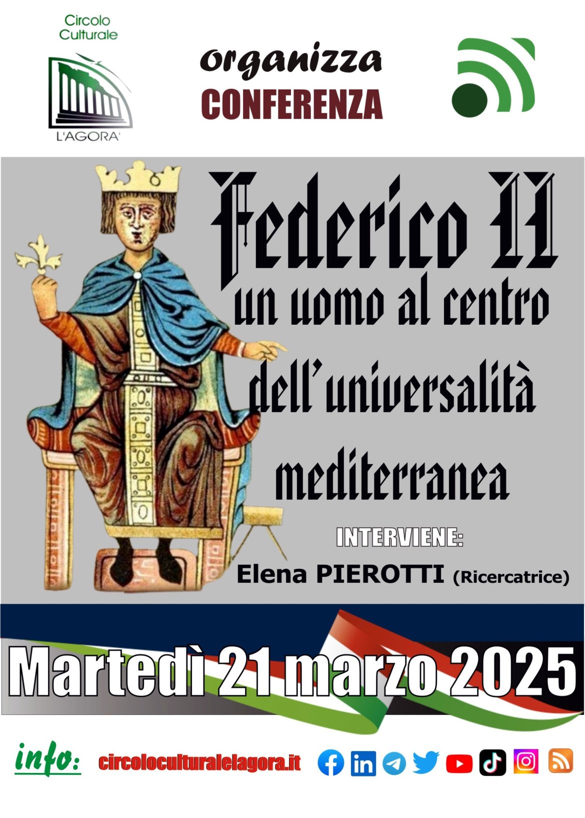 Venerdì 21 marzo, sulle varie piattaforme Social Network presenti nella rete, sarà disponibile la conversazione, organizzata dal Circolo Culturale “L’Agorà” sul tema “Federico II, un uomo al centro dell’universalità mediterranea”. Federico di Svevia nacque a Jesi, nelle Marche, il 26 dicembre 1194. Figlio di Enrico IV Hohenstaufen, Imperatore di Germania, a sua volta figlio dell’altrettanto celebre Federico Barbarossa. La madre di Federico, Costanza d’Altavilla, apparteneva alla Casata che deteneva il trono normanno di Sicilia ed infatti costanza era Regina di quel Regno. Con la sua nascita ed ascesa al trono Federico II unirà le due Corone.