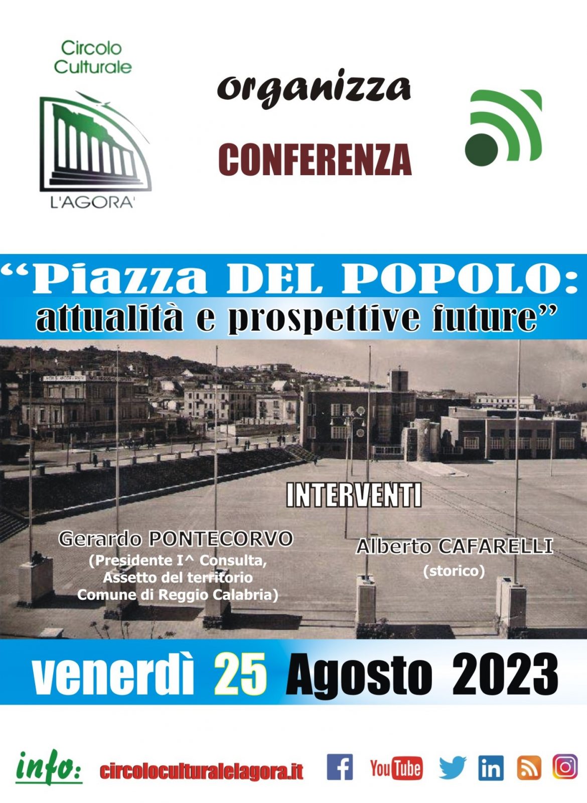 Venerdì 25 agosto sulle varie piattaforme Social Network presenti nella rete, sarà disponibile l’incontro, organizzato dal Circolo Culturale “L’Agorà” sul tema “Piazza del Popolo: attualità e prospettive future”. La conversazione, organizzata dal sodalizio culturale reggino, non si svolgerà nel consueto interno perimetrale di una sala convegni ma presso l’area perimetrale di Piazza del Popolo. La grande piazza riveste per la città una grande importanza storica, urbanistica, e mercatale ma ormai da anni versa in totale abbandono. I pilastrini (quelli ancora in piedi) della recinzione sono ormai semidistrutti, i tubi di raccordo mancano del tutto e quelli superstiti totalmente arrugginiti. Il distintivo e particolare architettonico costituito dai dieci pilastri rivestiti un tempo di candido marmo è in condizioni pessime: molte lastre sono mancanti, le poche che resistono risultano sfregiate e nella migliore delle ipotesi sporcate dal tempo e da vernici spray. Davvero preoccupanti sono le condizioni di quelli che forse un giorno erano stati dei gabinetti pubblici, e i cedimenti strutturali su via Monsignor De Lorenzo. Parteciperanno alla nuova conversazione Gerardo Pontecorvo (Presidente della 1^ Consulta – Assetto del Territorio – Comune di Reggio Calabria) e lo storico locale Alberto Cafarelli. Tenuto conto dei protocolli di sicurezza anti-contagio e dei risultati altalenanti della pandemia di COVID 19 e nel rispetto delle norme del DPCM del 24 ottobre 2020 la conversazione,organizzata dal sodalizio culturale reggino,sarà disponibile, sulle varie piattaforme Social Network presenti nella rete, a far data da venerdì 25 agosto.