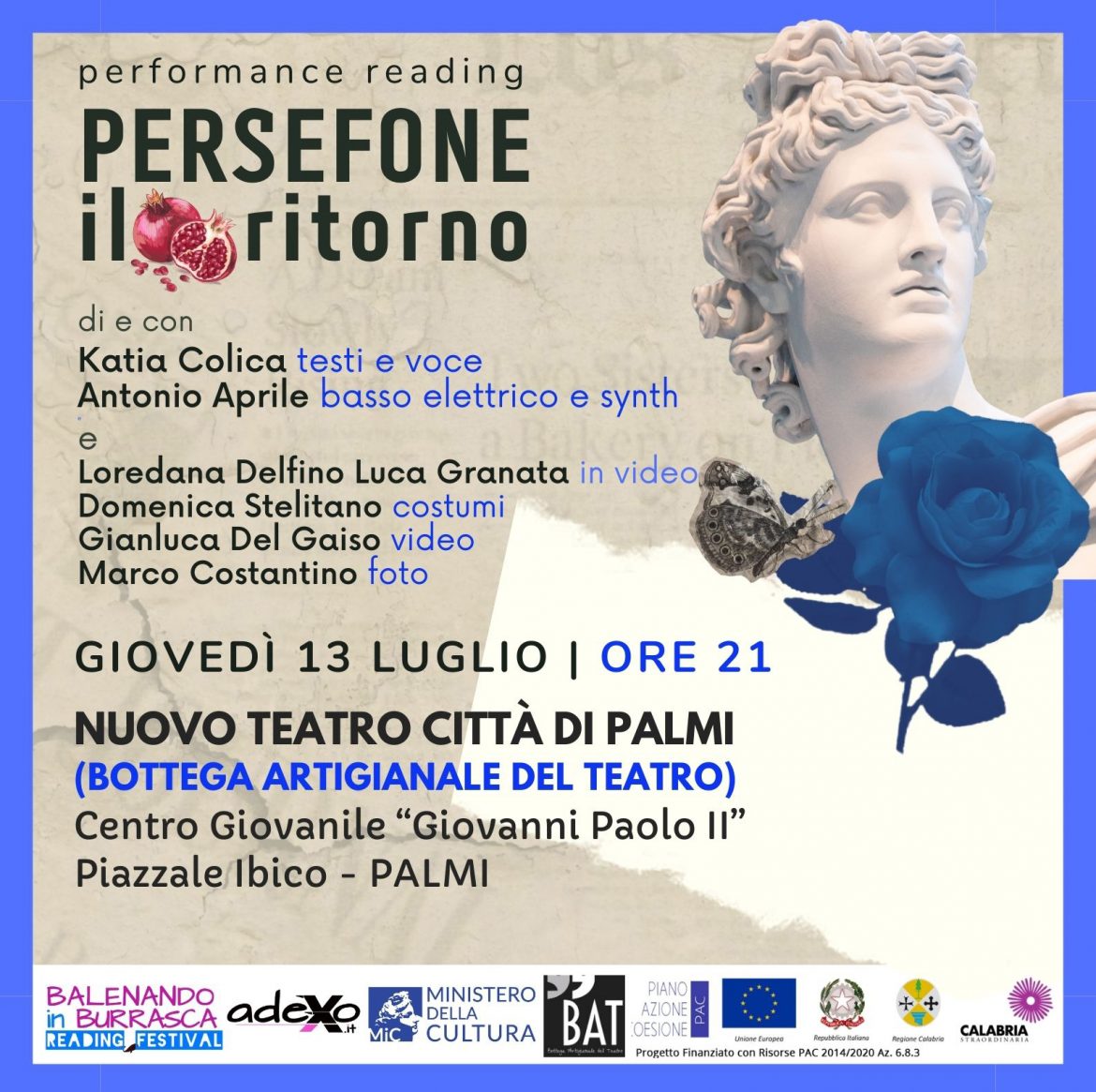 Sarà “Persefone – Il ritorno” a rappresentare il Balenando in Burrasca Reading Festival al Nuovo Teatro Città di Palmi, realizzando l’ultima tappa dedicata alla letteratura in performance reading della sua quarta edizione. Giovedì 13 luglio ore 21, nei nuovi locali della cittadina calabrese, andrà in scena lo spettacolo ispirato alla mitologia della dea Persefone, figlia di Demetra, rapita da Ade e divenuta regina degli Inferi. L’appuntamento è organizzato in collaborazione con l’Associazione Adexo, promotrice del festival. In scena Katia Colica, voce e testi, con le musiche di Antonio Aprile e le incursioni in video di Luca Granata e Loredana Delfino. I costumi sono a cura di Domenica Stelitano, video e foto di Gianluca Del Gaiso e Marco Costantino.