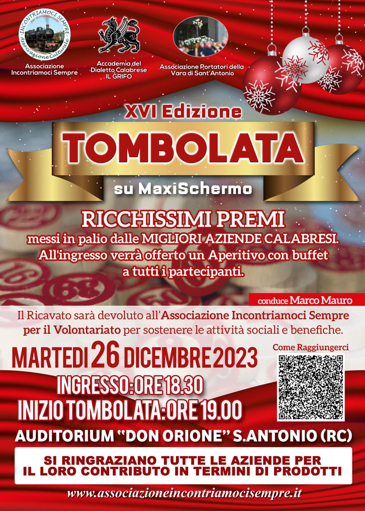 “Come non ricordare” dichiara il Presidente di Incontriamoci Sempre Pino Strati “l’edizione del 2008, con la commemorazione delle vittime del tragico evento del terremoto del 1908, in occasione del centenario, con la presenza del Rettore Don Bruno Fraulin. In queste ore, tantissime Aziende Calabresi stanno aderendo all’iniziativa, attraverso la donazione di loro prodotti e merce di grande pregio e valore, al fine di per arricchire il montepremi di una delle Tombolate più importanti del Centro Sud Italia.” Si prevede, come ogni anno, il pubblico delle grandi occasioni, per un evento che rappresenta un momento particolare di aggregazione di tanti cittadini e di parrocchiani di S.Antonio. “La conduzione e la regia” conclude Strati “saranno affidati a Marco Mauro e Marco Strati. Non mancheranno le esilianti scenette brevi teatrali del duo Cambera Festa. Naturalmente come da tradizione, il nostro Don Graziano, Rettore, porterà i saluti a nome della Comunità.”